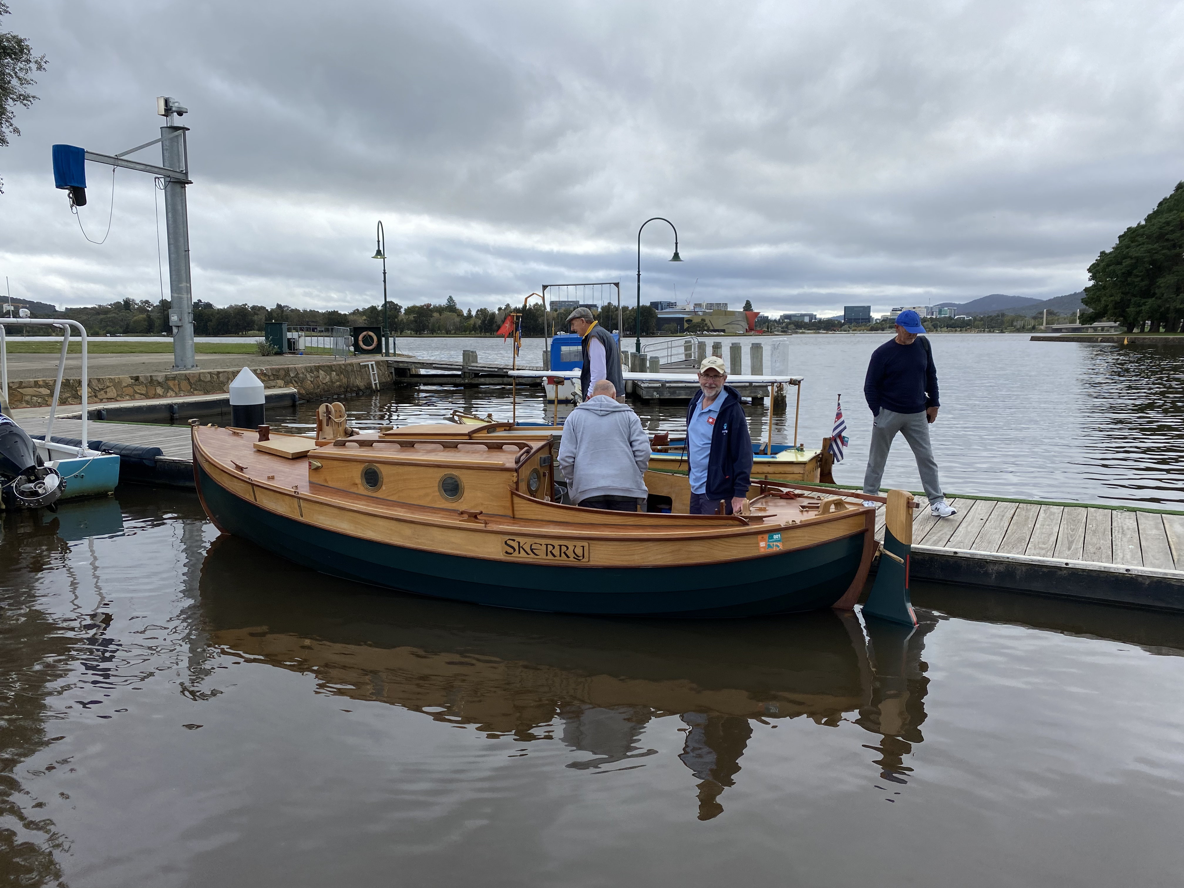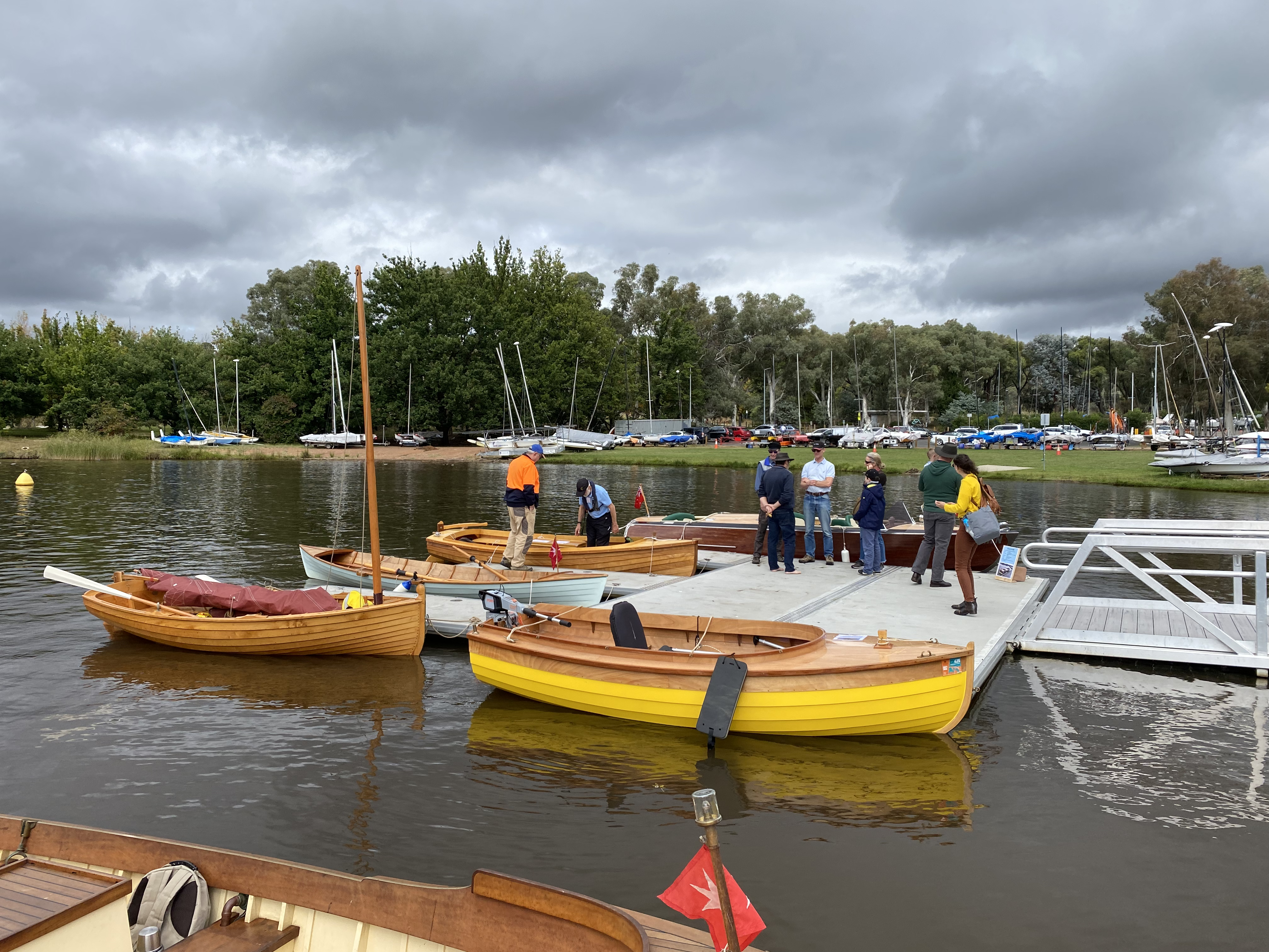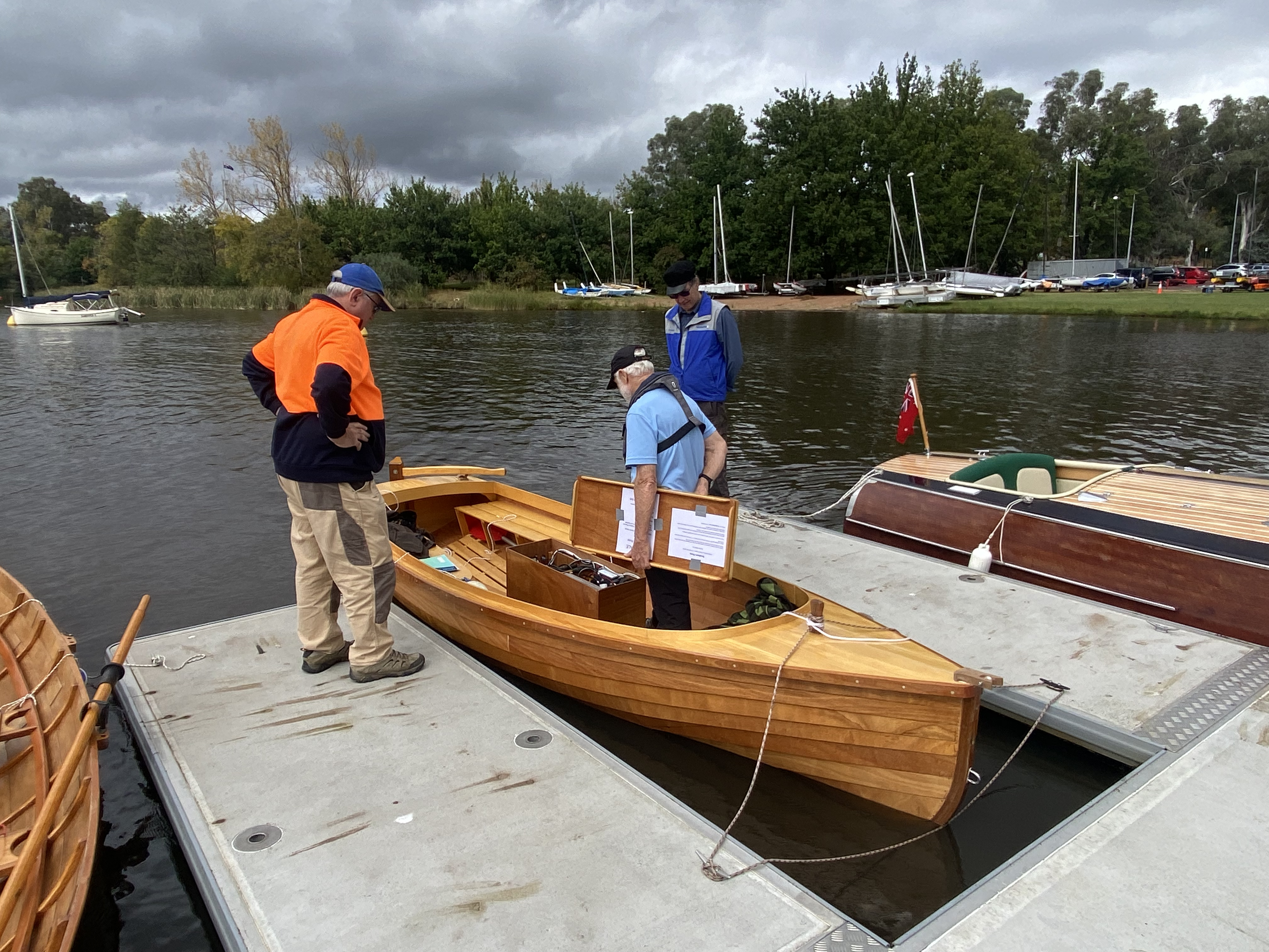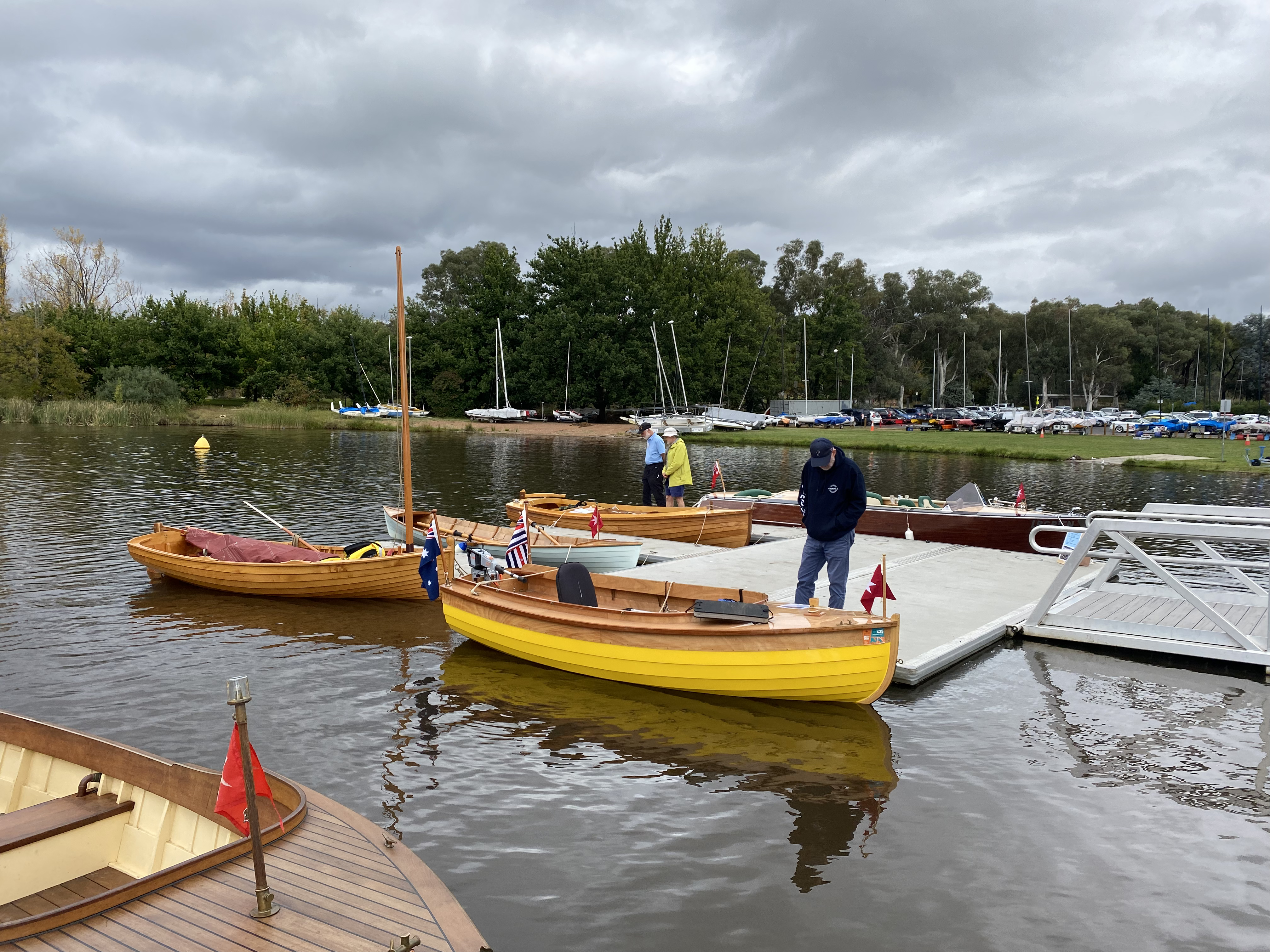 Philip (Pip) Scharf was a late arrival in his demonstration 8’ wooden pram powered by an electric trolling motor. Pip builds these boats at Mountain Boats in Fyshwick.