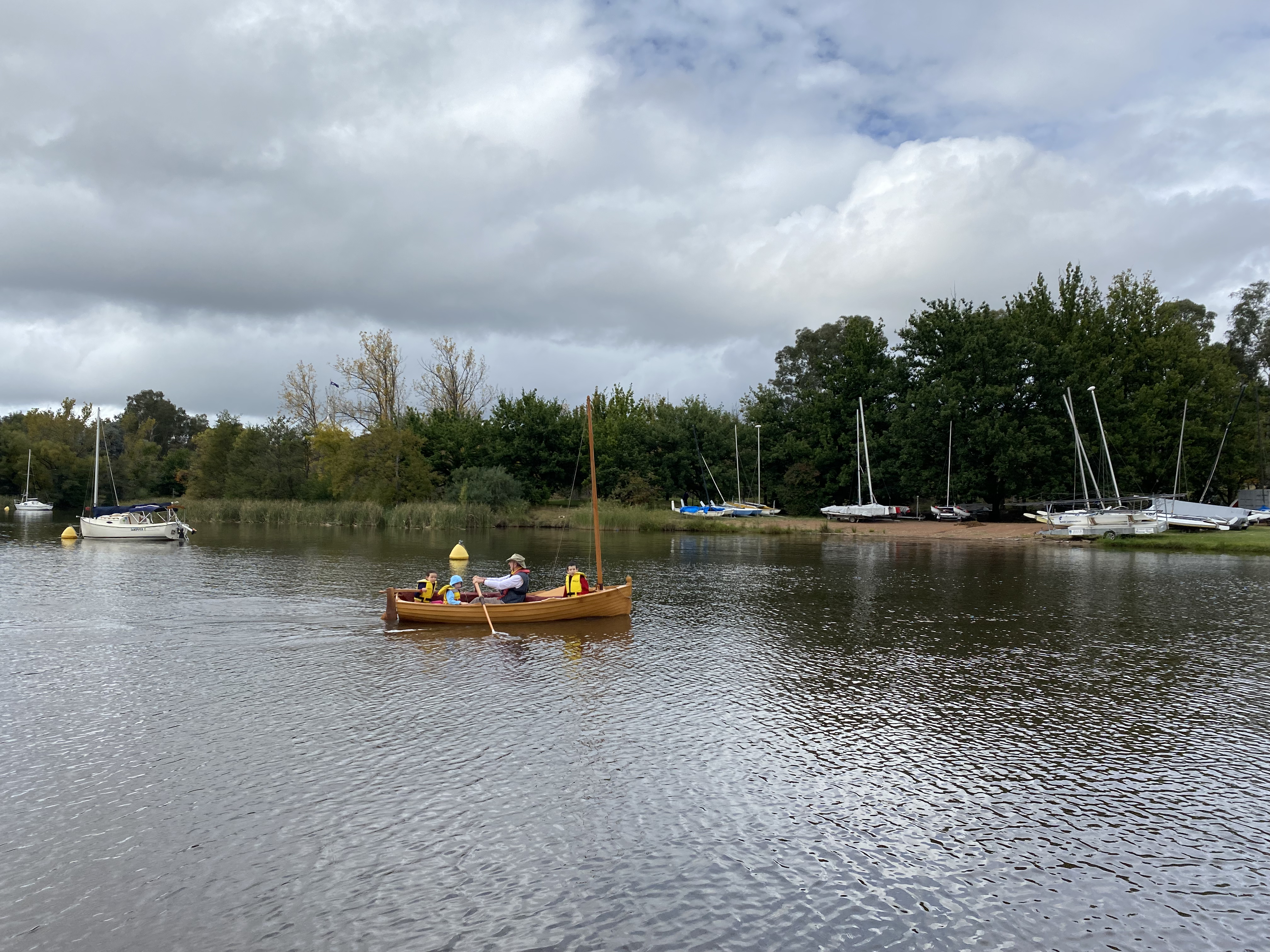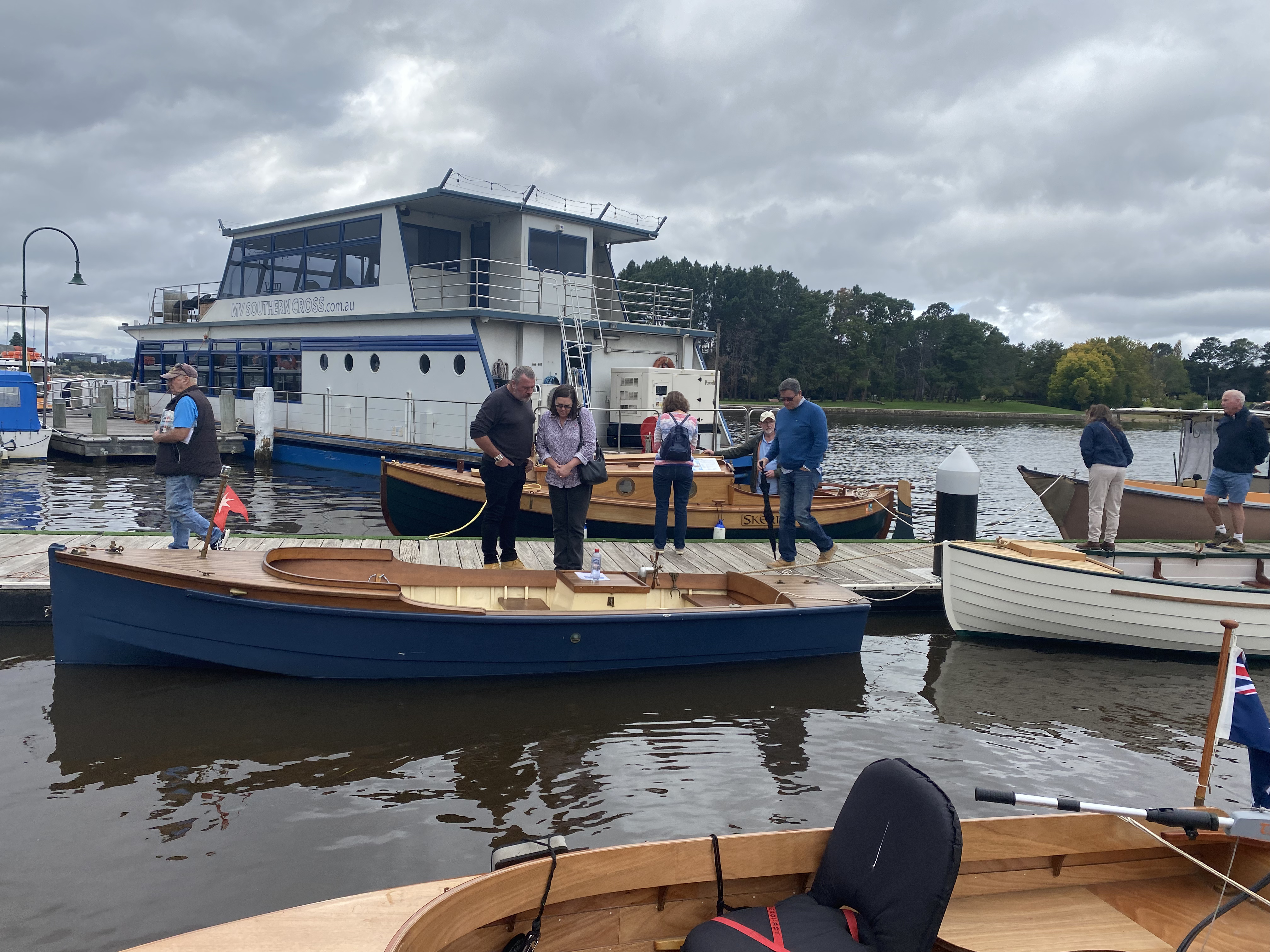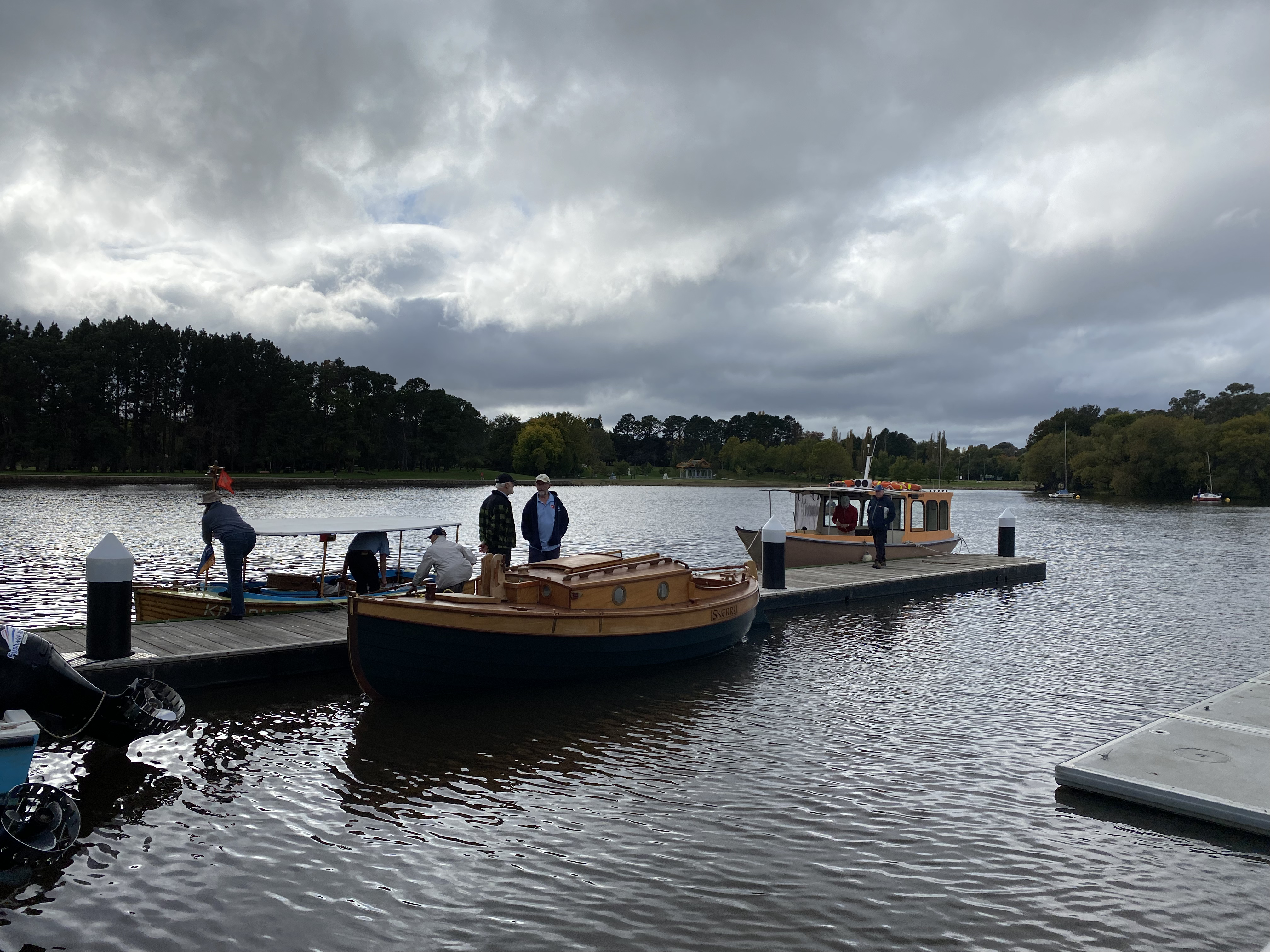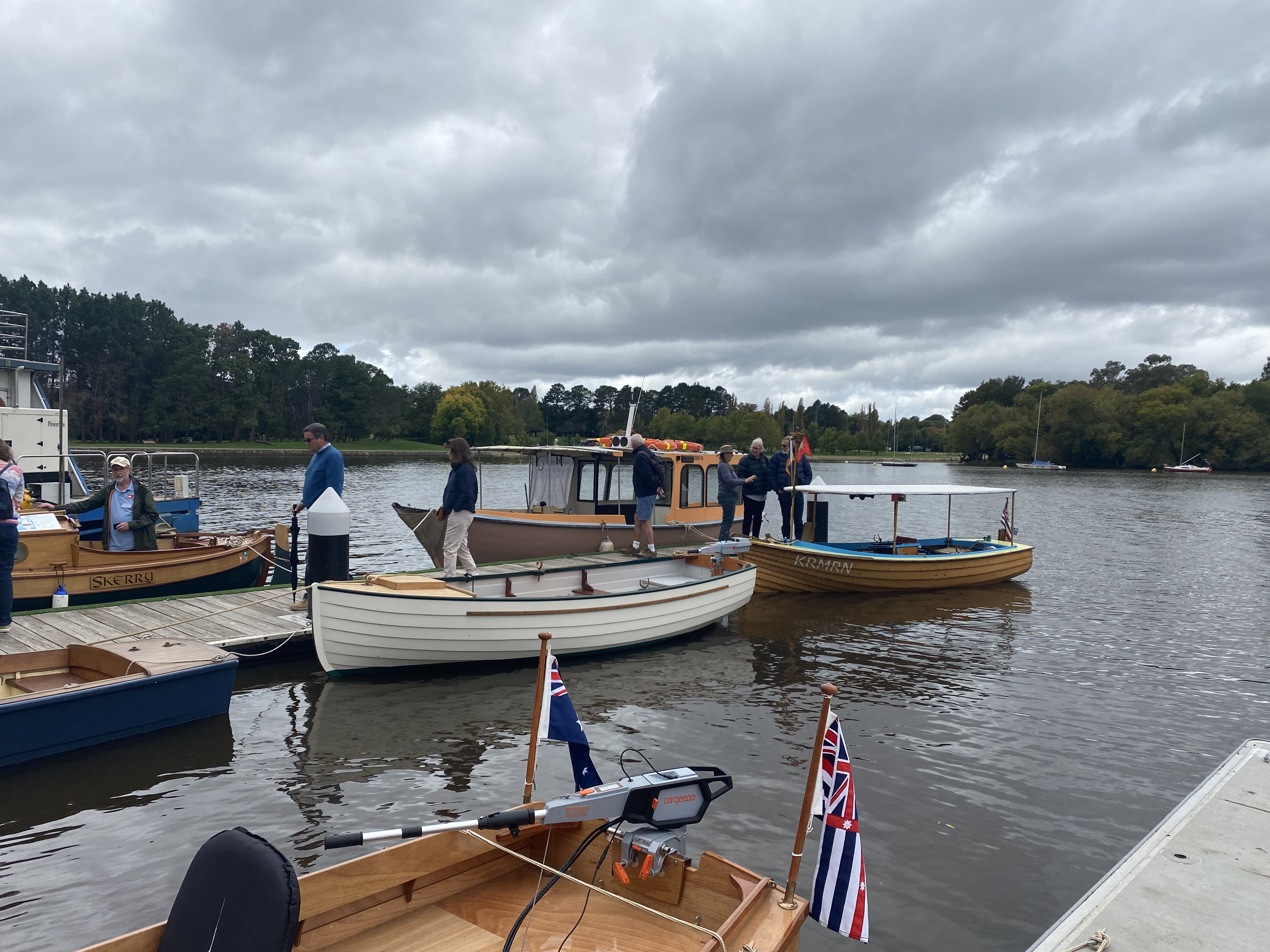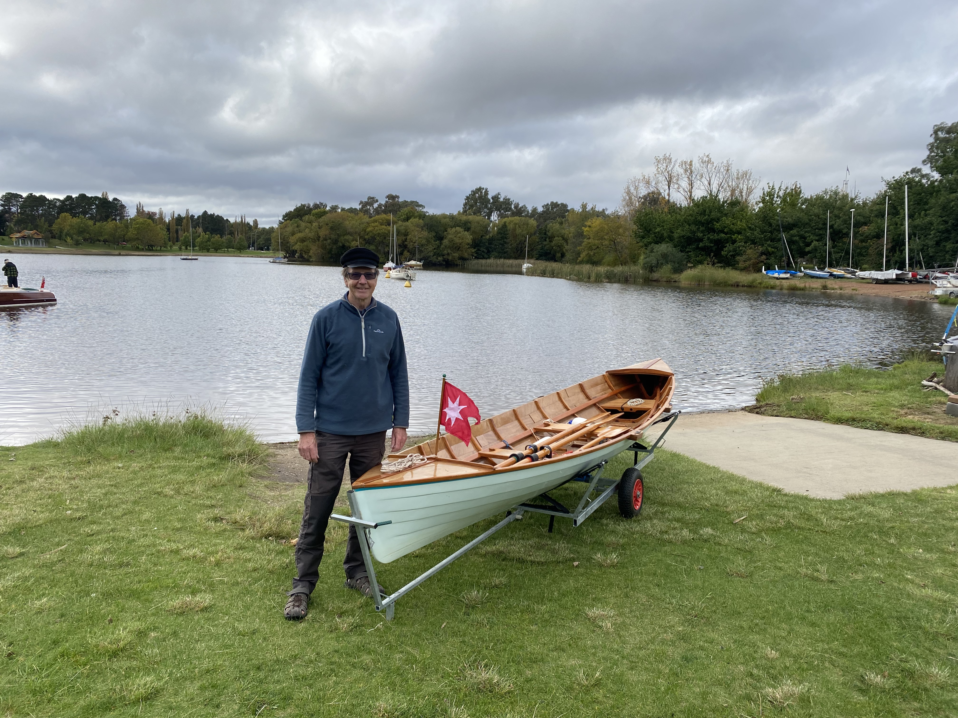 Philip (Pip) Scharf was a late arrival in his demonstration 8’ wooden pram powered by an electric trolling motor. Pip builds these boats at Mountain Boats in Fyshwick.