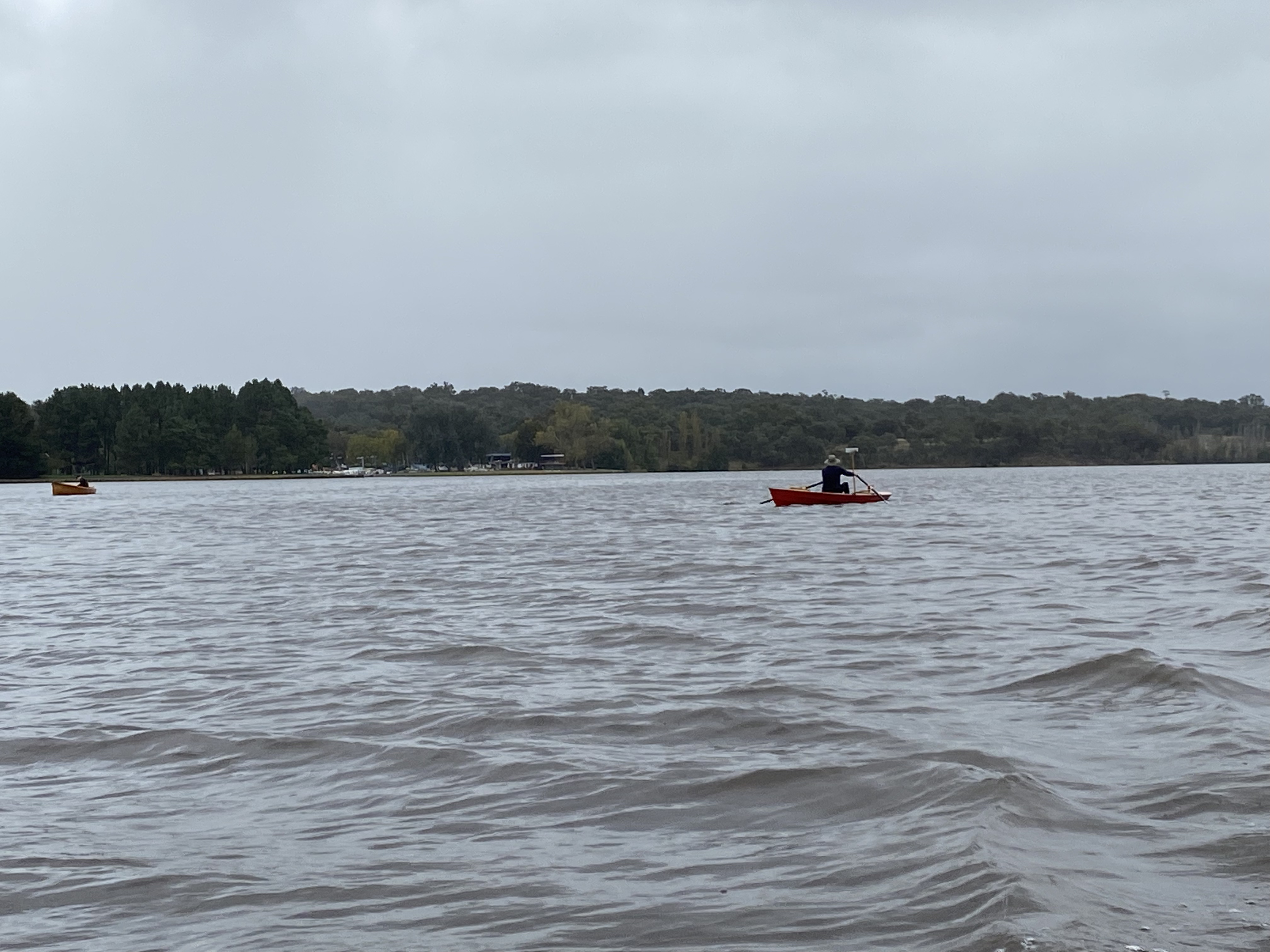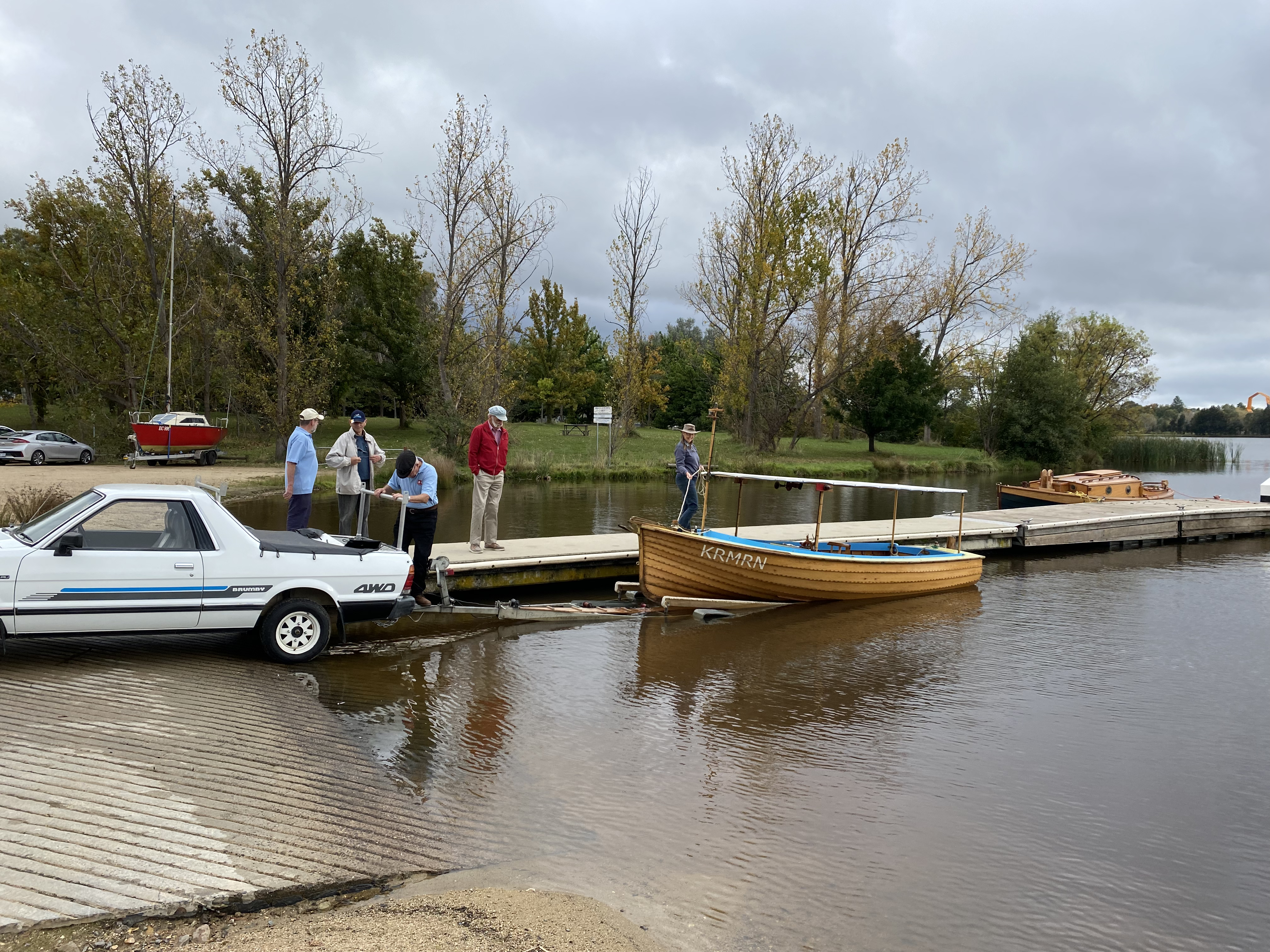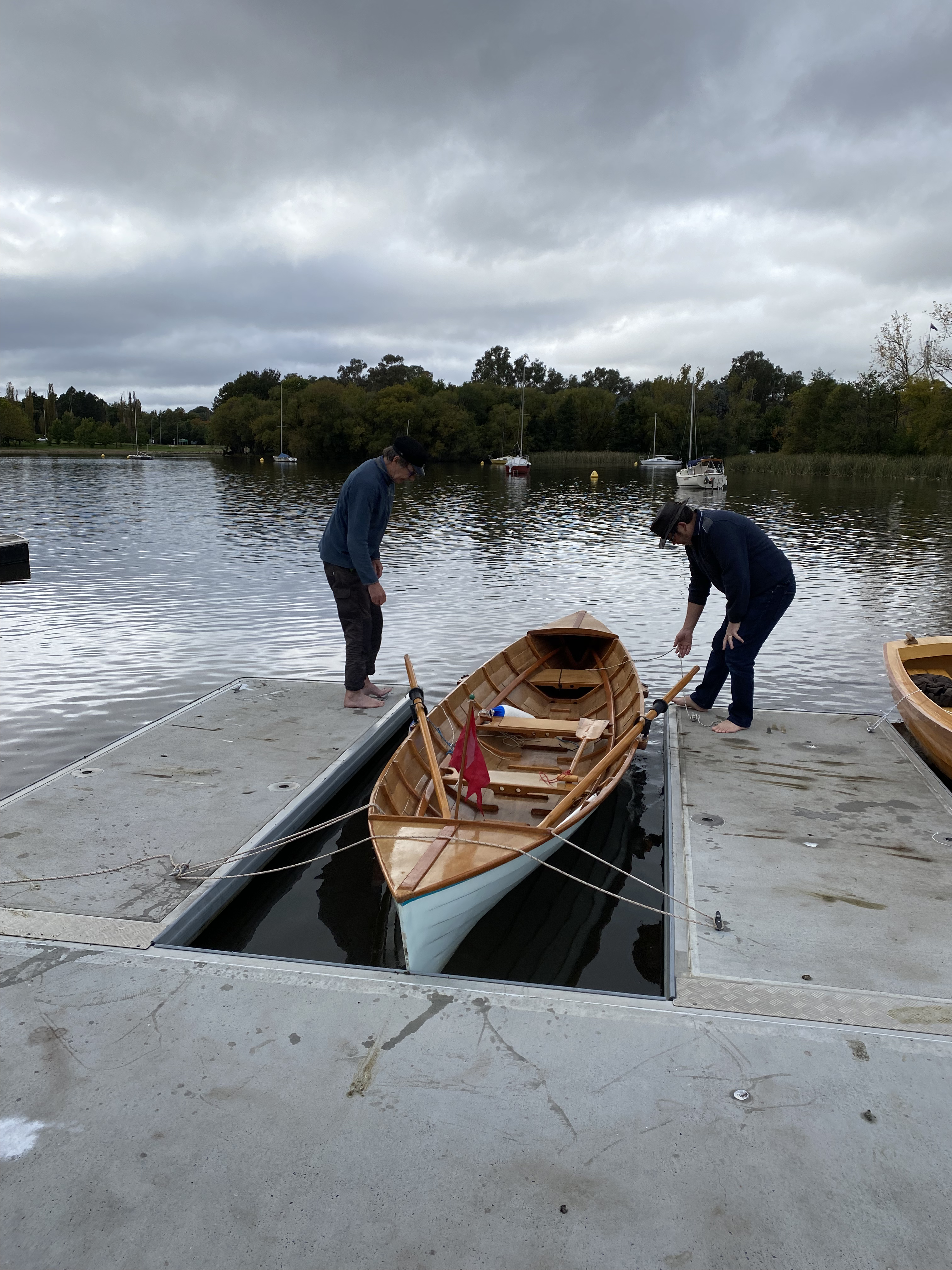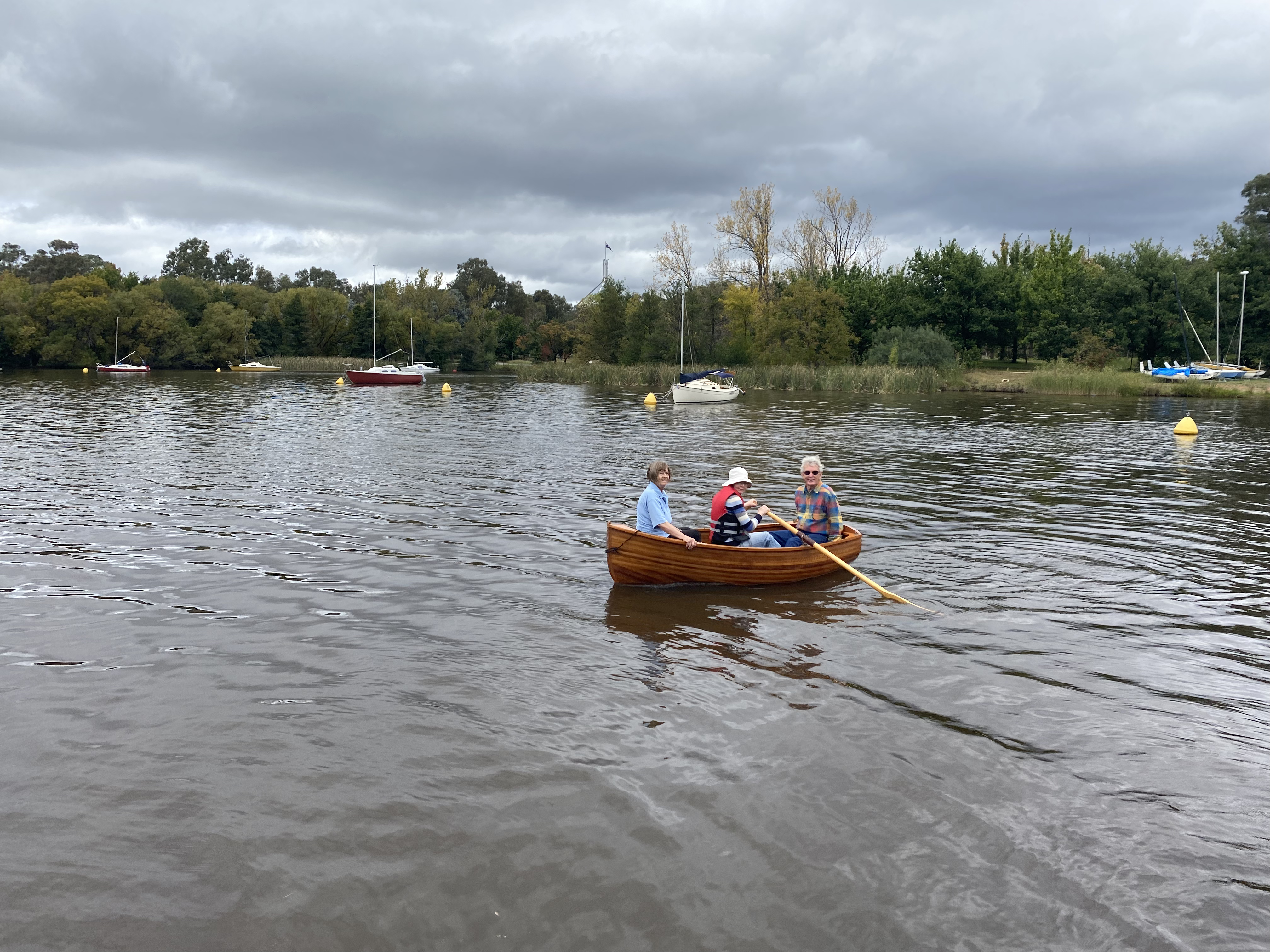 Philip (Pip) Scharf was a late arrival in his demonstration 8’ wooden pram powered by an electric trolling motor. Pip builds these boats at Mountain Boats in Fyshwick.