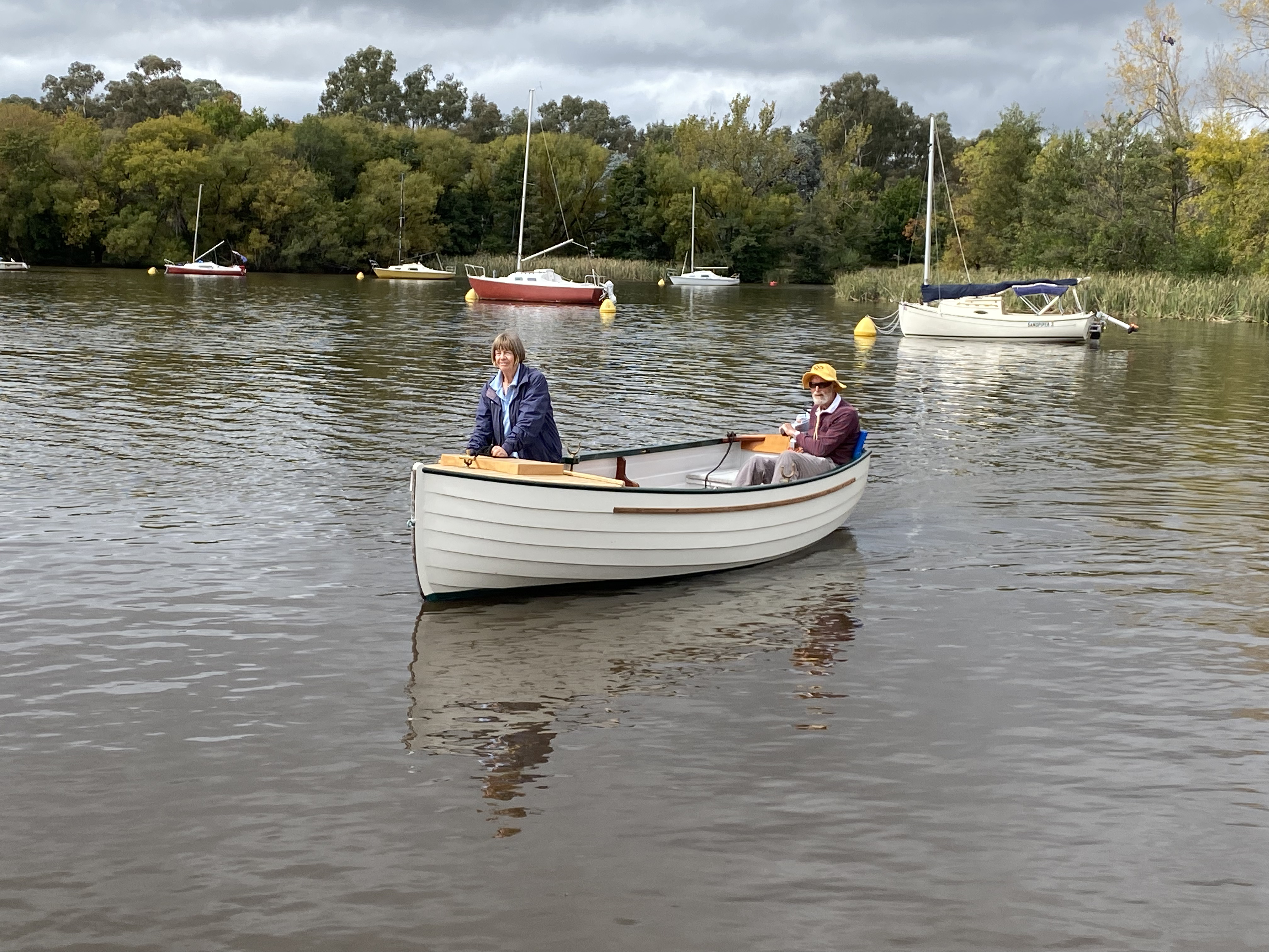 Tessa is a classic Jack Holt design 1976 Heron, with oars, sails and a 3.5 hp Tohatsu outboard, that meant Rod Panter could keep up with the parade. Tessa came a short distance from ‘interstate’ ie. Queanbeyan.